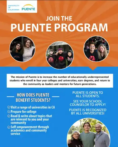 The Puente High School Program is designed to help students graduate from high school, become college eligible, and enroll in college through the efforts and support provided by a Puente-trained team.